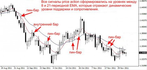 В примере ниже на дневном графике EURUSD 8 и 21-периодные ЕМА (построенные для цен закрытия) используются для поиска сигналов price action на уровнях между ЕМА, когда рынок находится в тренде.