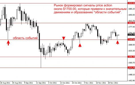 В примере ниже на дневном графике XAUUSD (спот золота) хорошо выделяется область событий в районе $ 1700,00.