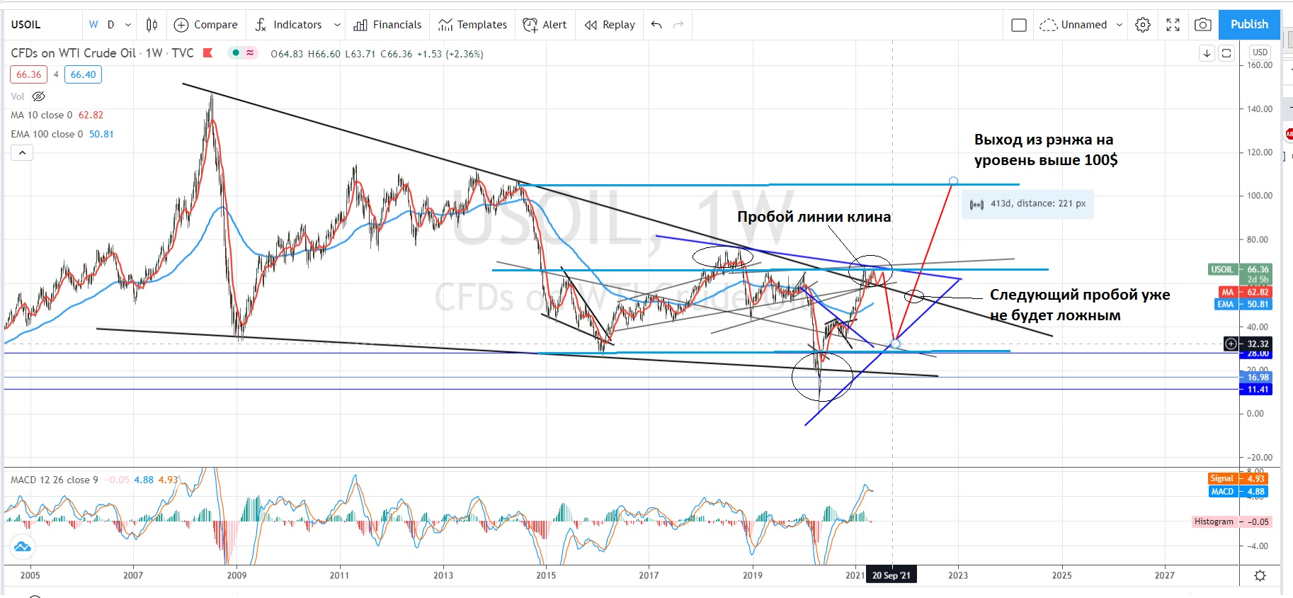 Линия клина пробита, скорее всего, он завершен. Теперь ожидаю глубокую коррекцию ( вместе с другим сырьем и рынков в целом) куда-то к 34-32$ за барель, после чего последуют быстрый выход вверх на уровень выше 100$.