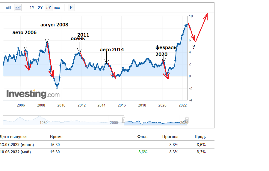 После какого-то спада в CPI скорее всего увидим новый взлет к 10% и более.
