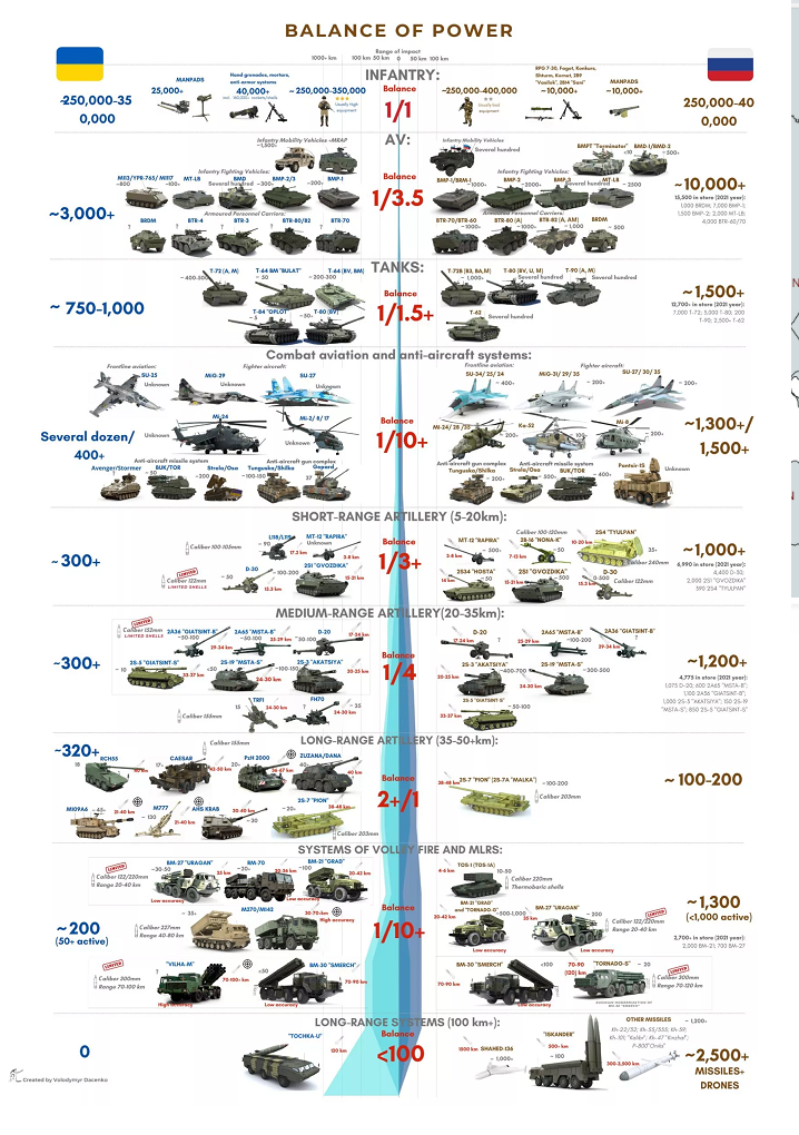 Артилерия — кратное отставание в ближней и средней, но в дальнобойной у Украины заметное превосходство.