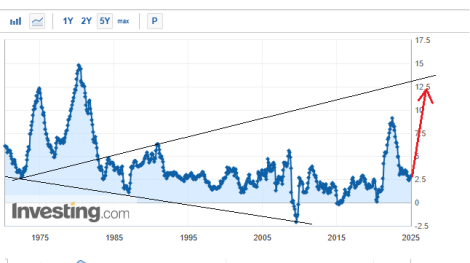 Инфляция идет вслед за сырьем с отставанием буквально пару месяцев. Впереди ее взлет к 12% в долларе