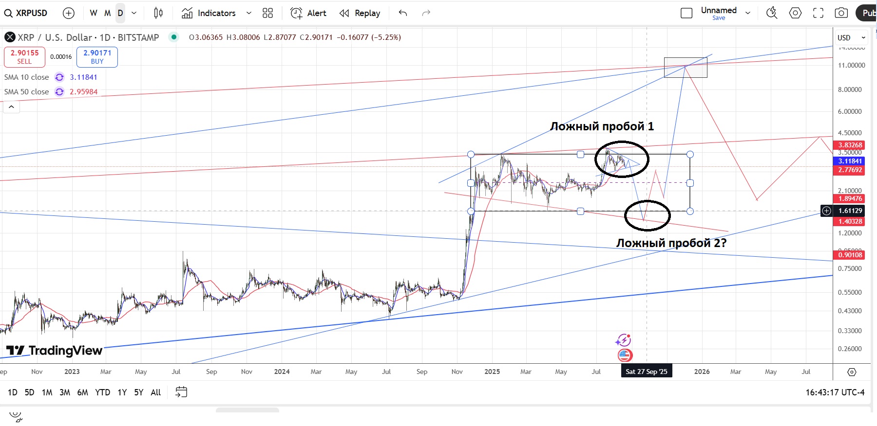 Вероятен паттерн двойной ложный пробой, для его формирования нужно выйти вниз из боковика а потом в него вернуться: