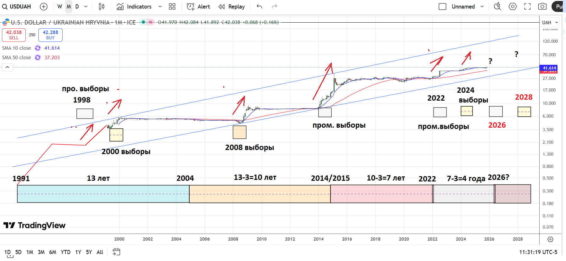 Еще интересно, в 100% случаев обвалы в курсе USDUAH происходят в годы выборов в США. ( президента или промежуточных выборов). Следующий такой год опять же 2026.