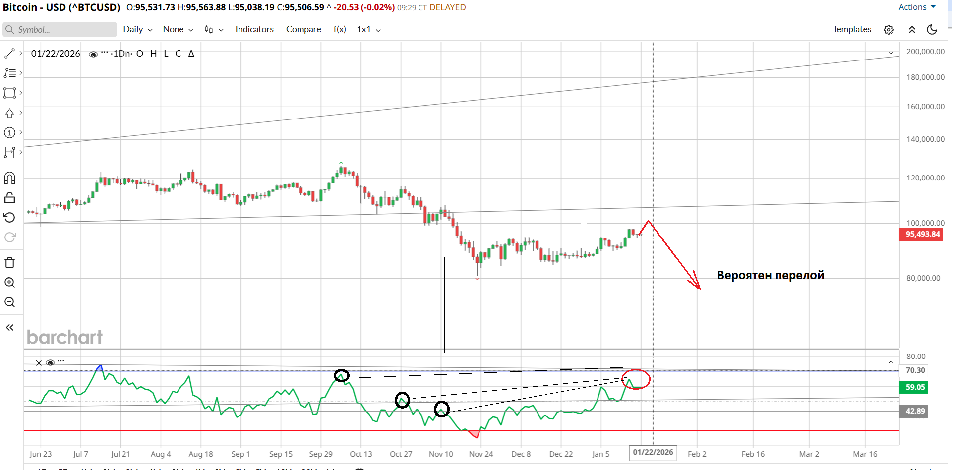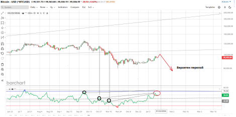 P.S. Если сейчас, к примеру, будет рывок к 100 тыс и индикатор RSI, при этом, покажет уровни выше, чем ист. хаи октября 2025, это только усилит сигнал вниз.