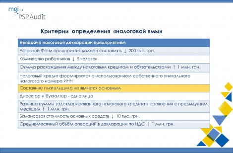 Алгоритм определения предприятий — «налоговых ям» предполагает ежемесячную оценку по следующим 10 критериям указанным на слайде. Состояние плательщика определяется отдельным кодом, и не соответствие коду 0 «Основной плательщик» ведет к возможной отработки предприятия, как «налоговой ямы».