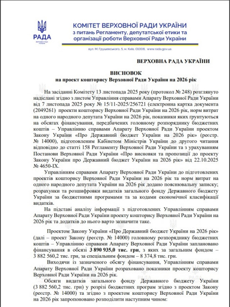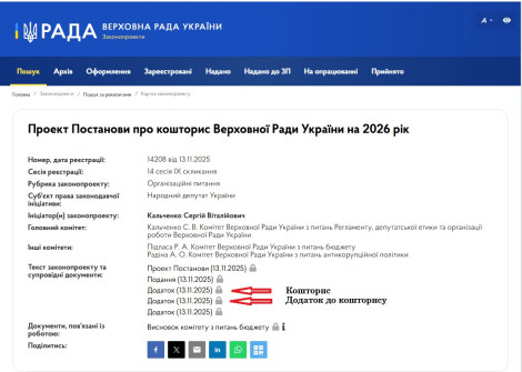 Переходим на сайт Вр к «карточке закона» Про кошторис Верховної Ради України на 2026 рік