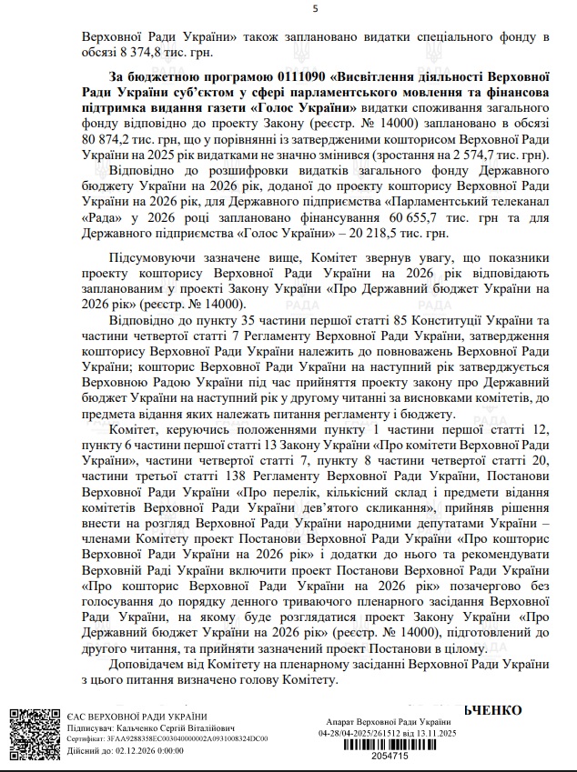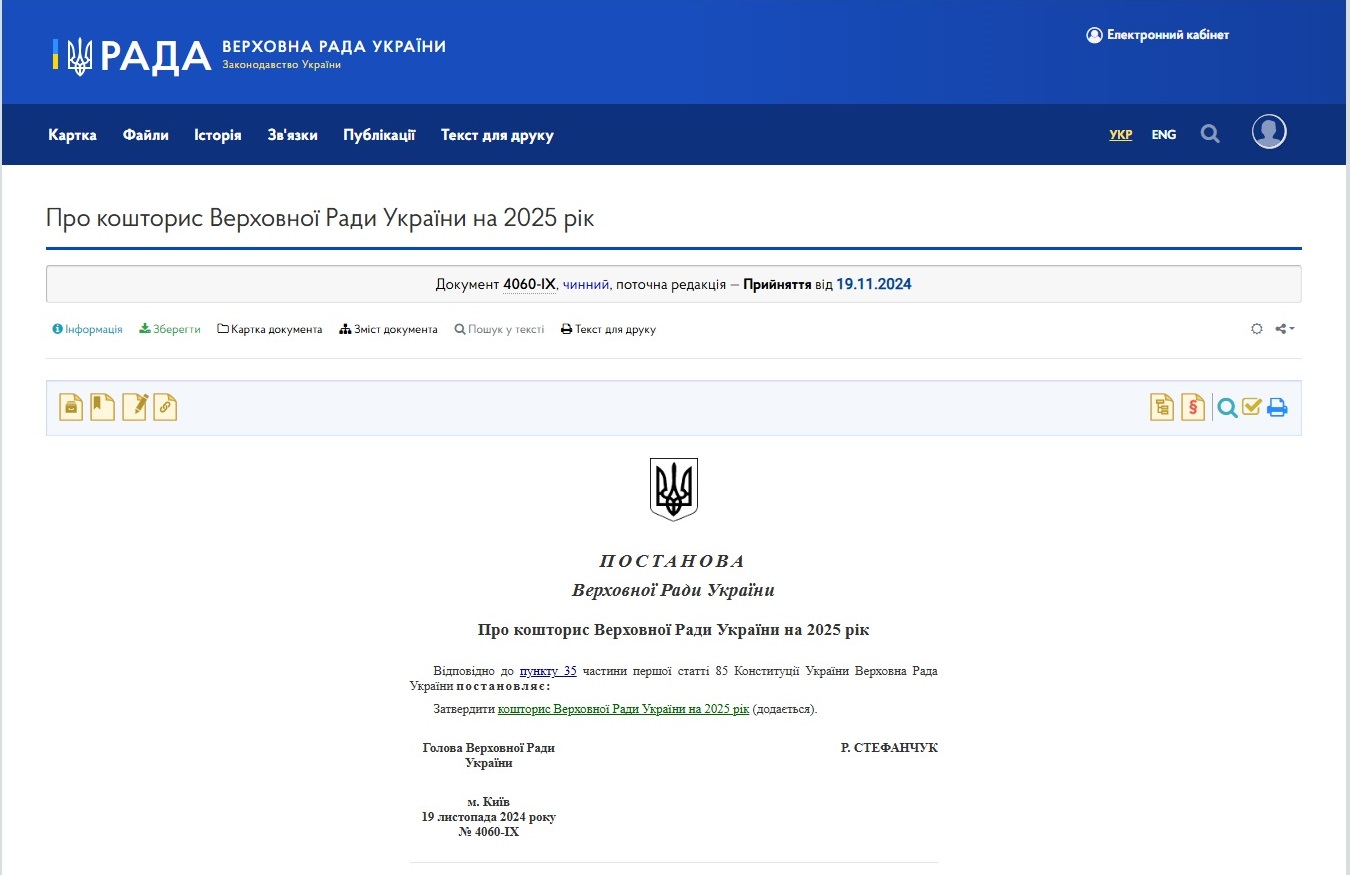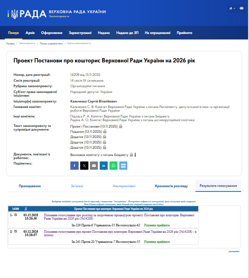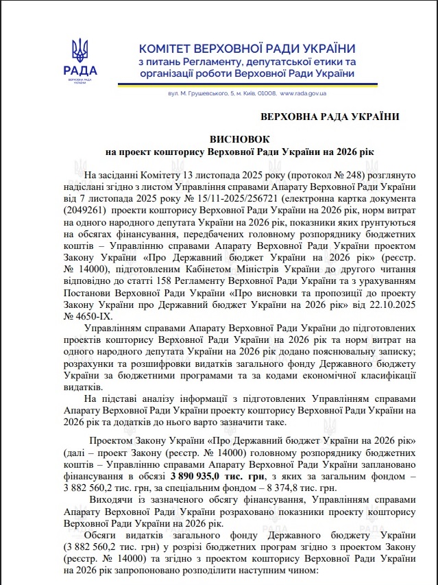 Переходим на сайт Вр к «карточке закона» Про кошторис Верховної Ради України на 2026 рік