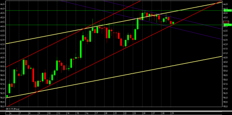 Фьючерс на нефть марки Brent, что называется, «ходит по лезвию», зажатый в в горизонтальном диапазоне 64,17 — 65,78. Он колеблется возле линии сопротивления восходящего трендового канала, обозначающего ралли, которое началось в середине марта (на рисунке выделено желтым цветом). В то же время, мы можем наблюдать намечающийся отбой от уровня поддержки зародившейся 8 апреля «усиливающей» тенденции (на рисунке выделено красным).
