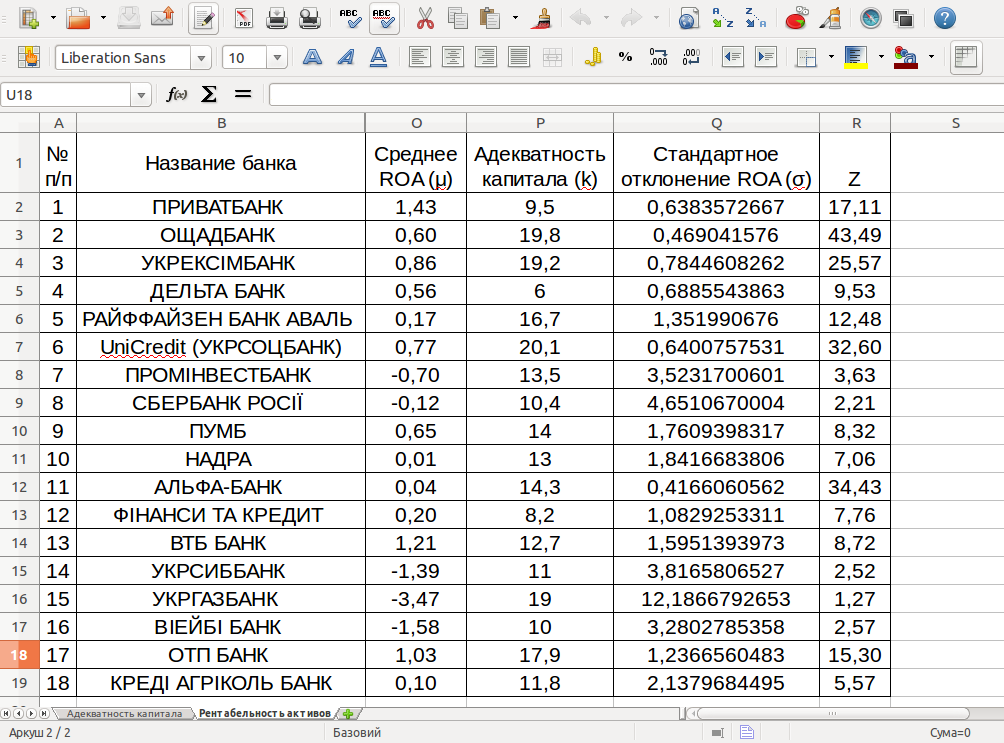 Показатель устойчивости (Z) = (Среднее значение ROA + Показатель адекватности собственного капитала)/Стандартное отклонение ROA