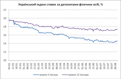 Просматривая данные индексы с начала этого года, можно увидеть, как они регулярно снижались с первых дней января и по конец июля. В начале января ставки, например, на короткие гривневые депозиты (3 и 6 месяцев) были свыше 19% годовых. Уже в конце января они опустились до диапазона 18-19%, в феврале-марте — до 17-18%, в апреле — до 16-17%, в мае до 15-17%. А в летние месяцы эти ставки вообще снизились до размеров 14-16% годовых.