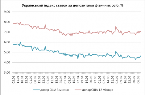 Однако в начале августа наметился перелом данной тенденции. Если, например, средняя ставка по 3-месячному гривневому депозиту за предыдущую неделю (29.07 — 2.08) составляла 14,32%, то по нынешней неделе (5.07 — 9.07) она повысилась до 14,49%. По 12-месячному гривневому депозиту было 17,13%, а теперь стало 17,29%. По 3-месячному долларовому депозиту на предыдущей неделе было 4,42%, а на нынешней неделе подросло до 4,52%. По 12-месячному долларовому депозиту было 6,86%, стало — 7,00%.