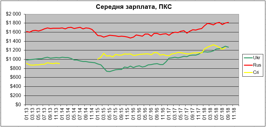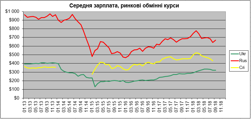 (1) Реальная средняя зарплата в подконтрольной части Украины превысила таковую в Крыму чуть более, чем на 2%, что является максимумом с момента аннексии Крыма (рис. 1—4). По обменным курсам средняя зарплата в подконтрольной части Украины в августе достигла многолетнего максимума по отношению к крымской — 74,5% (максимума со времён первого обвала рубля после аннексии Крыма).