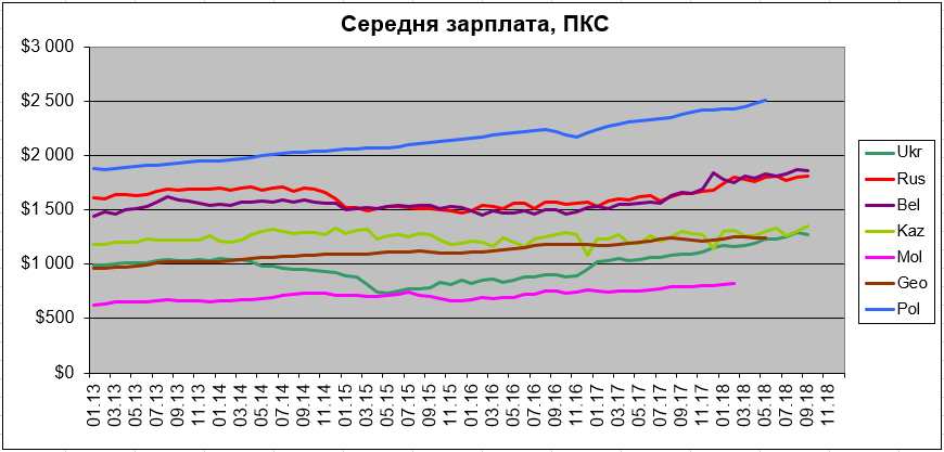 (3) По ППС средняя зарплата в Украине ещё сильнее приблизилась к уровню Казахстана и Грузии (квартальные данные по Грузии поступают со значительным запаздыванием, как и квартальные данные по другим странам). В августе отрыв Казахстана был сокращён до 0,5% — минимального значения за всю историю наблюдений с 2011 г. (за исключением декабря 2017 г. ввиду того, что в Казахстане сезонность в декабре претерпела изменений: раньше декабрьские зарплаты отличались от среднемесячных куда сильнее, чем в последние пару лет) (рис. 5).