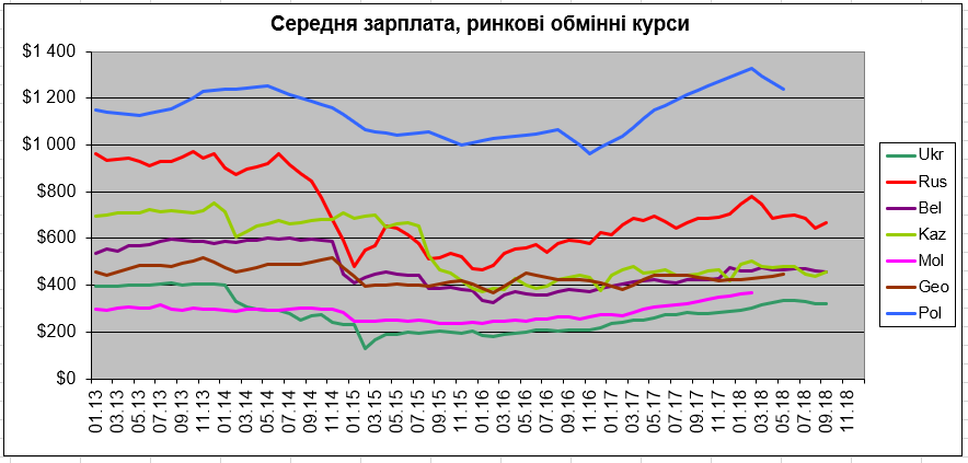 (5) За последние 3 месяца средние зарплаты рассмотренных стран мира, в целом, продолжили нисходящую тенденцию по отношению к украинской: как по рыночным обменным курсам, так и по ППС (рис. 7, 8).