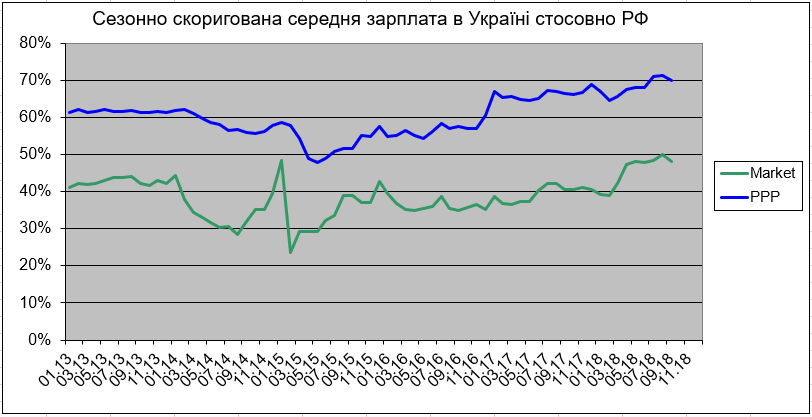 (7) Средняя зарплата в РФ по отношению к украинской продолжила снижение как по ППС, так и по рыночным обменным курсам, с обновлением многолетних минимумов и там, и там. В отличие от предыдущих периодов, сезонного роста российских зарплат по отношению к украинским по обменным курсам в этом году не произошло: сезонное ослабление гривны сопровождалось сопоставимым ослаблением рубля под действием санкций против путинского режима (рис. 9 и инвертированный к нему рис. 10).