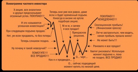 На приведенной здесь психограмме, которую я позаимствовал у известного вам инвестиционного консультанта Сергея, отражено типичное поведение начинающего инвестора. Схема достаточно условна; изображенная волна может быть, как угодно сжата, растянута, обострена или сглажена; главное то, что она работает на практике. Можно проверить ее на себе, на своих друзьях и родственниках, можно вспомнить ситуации, которые уже остались в прошлом, но которые этой схеме соответствовали. Можно нацелить ее в будущее, можно построить нечто подобное для любой ситуации. Кто-то, безусловно, это делает. Стоит ли в таком случае удивляться, если этот кто-то остается в выигрыше там, где многие другие проигрывают?