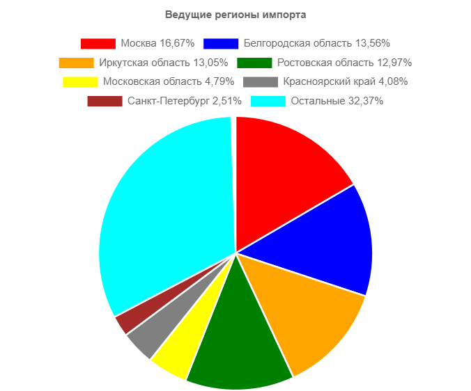 В I квартале 2021 г. российский импорт из Украины осуществлялся преимущественно в Москву, Белгородскую область, Иркутскую область, Ростовскую область и Московскую область. Список компаний импортёров из Украины проанализирован на сайте obzorved.com/analysis/im/ru/UA/all/