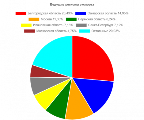 В январе — июне 2021 г. российский экспорт товара осуществлялся преимущественно из Белгородской области, Самарской области, Москвы, Пермской области и Ивановской области.