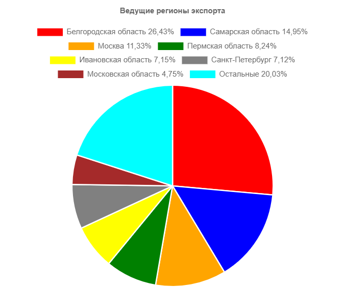 В январе — июне 2021 г. российский экспорт товара осуществлялся преимущественно из Белгородской области, Самарской области, Москвы, Пермской области и Ивановской области.