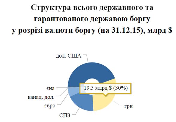 Структуру всього державного та гарантованою державою боргу станом на початок 2017-го року у розрізі валют оцінити складно, оскільки автори документу (п_1.1.д та п_1.5) боргов та гарант зобов до повного погашен.xls не навели цих даних. Єдине, що можу сказати з цього приводу це те, що міністерство фінансів України активно використовує рефінансування старих валютних боргів і набирає нові.