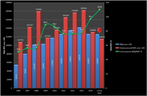 И теперь ВВП, но уже по среднему курсу за 2014 год, оценивается в 130,9 млрд. долл. Но самое интересное, что при этом падение за год составляет28,1%. И это совершенно не соответствует падению физического ВВП в 6,8%.