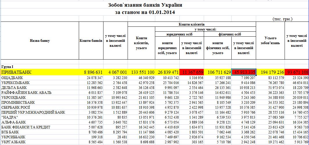 Если грубо, то потеря ⅔ активов банковской системы за 2 года, эквивалентна потере 100 млрд. в долларовом эквиваленте. По 50 млрд. долларов за год. По группе I (старая классификация) вес депозитов физических лиц более ⅓, а по Приват банку и вовсе 56%. Вот и считайте ⅓ от 50 млрд. долл. только по физлицам. Однозначно: налицо огромный отток депозитов, как в гривне, так и в валюте. Кстати, показатель оттока депозитов в валюте в размере 32,1% (по физлицам и вовсе 36,3%) за 2015 год косвенно соответствует грубой оценке.