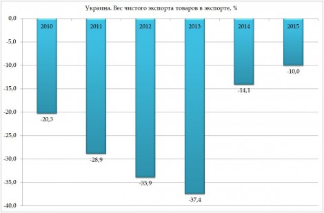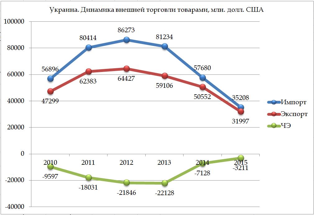 2. Основным, но не единственным, условием роста гривны является рост ВВП и превышение экспорта над импортом (так называемый чистый экспорт). По поводу ВВП ваш покорный слуга сломал немало копий, доказывая ошибочность статистики минфина по ВВП в USD. В конце концов, администрация сайта исправила ошибку и показала падение ВВП в 2014 году на уровне 51,505 млрд. долл., или на 28,1%.