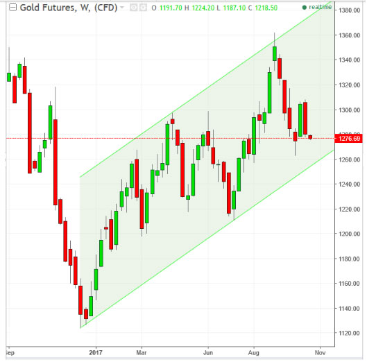 Рост золота в октябре-ноябре 2016 года трейдеры окрестили «Трамп-трейдом». Тогда мало кто ожидал, что на выборах выиграет именно Трамп, потому после оглашения результатов трейдеры предпочли перевести деньги в золото. После того, как паника улеглась, золото начало свой относительно уверенный рост. Пока инвесторы вкладывают деньги в акции и доллар (драйверы роста — положительная квартальная отчетность, уверенность в поднятии учетной ставки ФРС и будущая налоговая реформа), золото понемногу снижается.