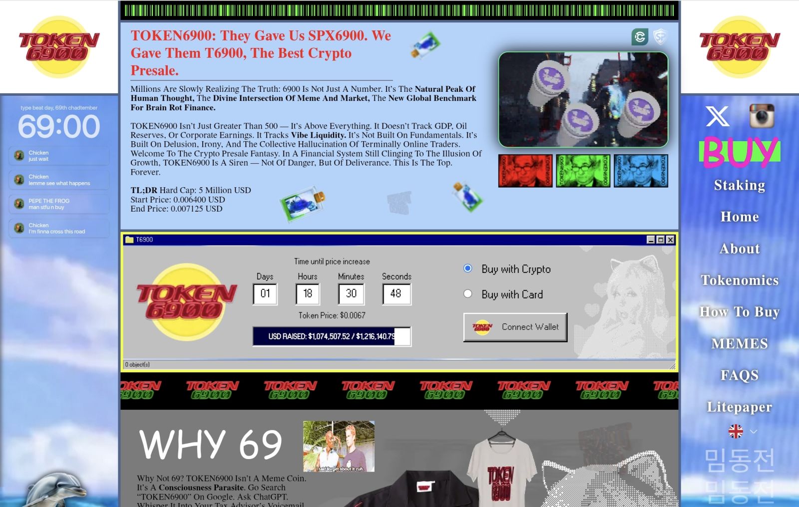 Token6900 высмеивает такие финансовые символы, как индекс S&P 500, и прямо заявляет, что не собирается притворяться «полезным». Наоборот, токен объединяет тех, кто устал от формальных правил и хочет зарабатывать на понятных и громких идеях. Проект прозрачен: никакого скрытого распределения, более 80% токенов продаются через открытый пресейл, а токеномика прописана публично.