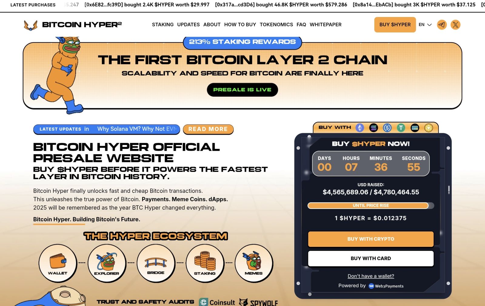 Токен $HYPER выполняет сразу несколько функций: он нужен для комиссий, используется в механизмах голосования и приносит вознаграждение через стейкинг — 216% годовых. Стоимость токена составляет $0,012375. На июль 2025 года собрано $4 млн в рамках открытого пресейла, и проект продолжает активно продвигаться на тематических платформах. Главной задачей Bitcoin Hyper остается масштабирование Биткоина без компромиссов по децентрализации.