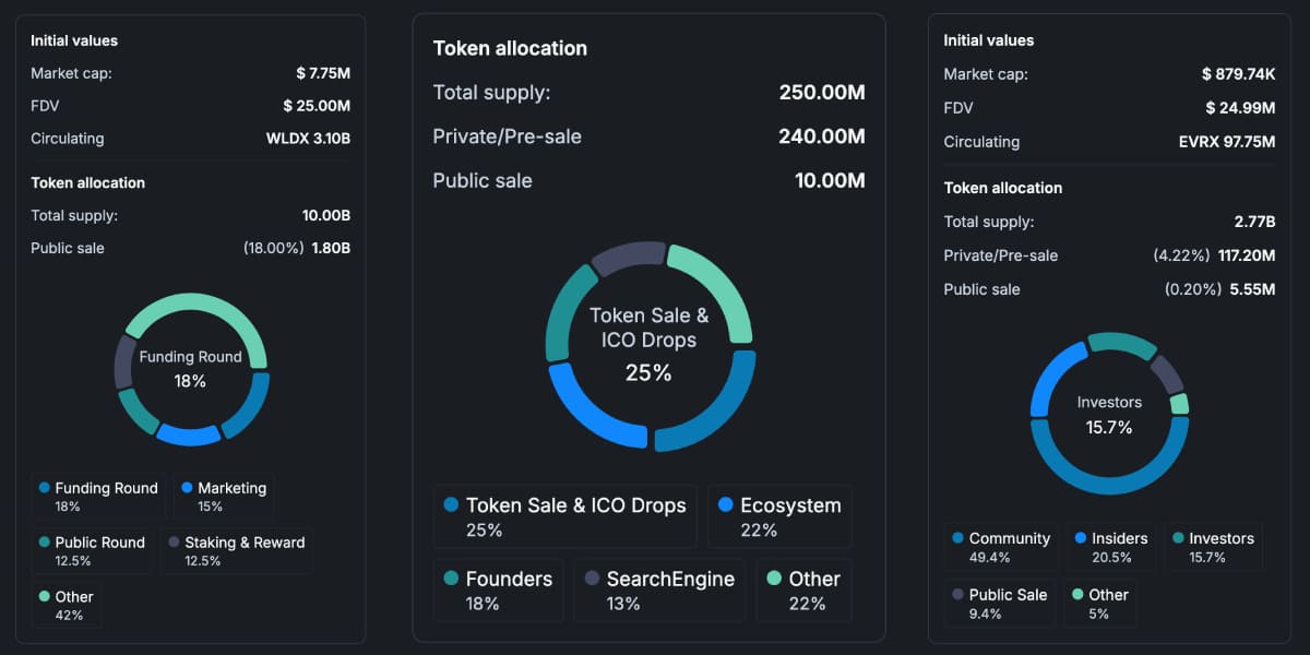 После платформы и условий разблокировки следует посмотреть еще и на базовые цифры токена, которые помогают понять механику его будущего запуска. Здесь важно, чтобы на старте в обращение не выходила совсем мизерная часть токенов, а разрыв между стартовой и полной оценкой не был слишком большим. В противном случае, это означает, что в начале рынок получит лишь небольшую часть предложения, а будущие разблокировки могут сильно давить на цену.