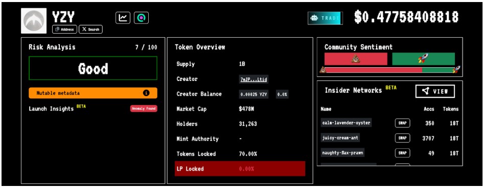Токеномика с самого начала создавала неравные условия. Лишь 20% эмиссии попало в публичный оборот, 10% — обеспечивало ликвидность, а остальные — около 70% supply — были сосредоточены в Yeezy Investments LLC — структуре, связанной с Канье. Предполагался постепенный разблок в течение двух лет, но сам факт концентрации настораживал инвесторов. RugCheck сразу обозначил несколько критических рисков: ликвидность не была заблокирована никоим образом (LP Locked = 0%), метаданные токена оставались переменными, а контракт позволял менять комиссии и даже блокировать продажи.