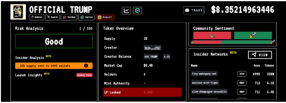 Результат — график $TRUMP оказался гораздо более «живым», чем у YZY: токен получил более 800 тыс. холдеров и капитализацию более $8 млрд на пике. В то же время RugCheck показал ключевые красные флажки: ликвидность в пуле не была заблокирована (LP Locked = 0%), а инсайдеры сохранили контроль над основными объемами. Это означает, что риск управляемых сливов остается высоким, даже несмотря на широкое участие комьюнити.