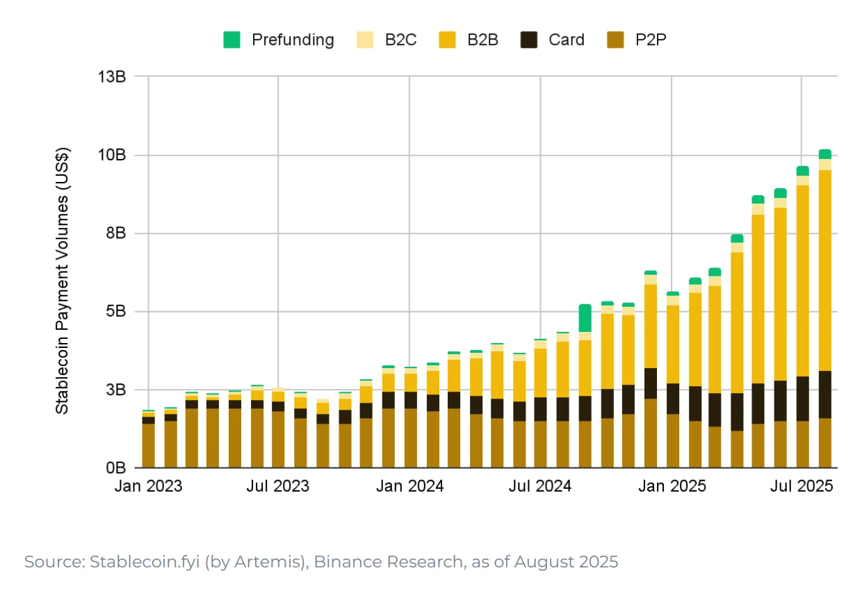 Эту картину подтверждает аналитика Artemis: с начала 2023 года совокупный объем платежей в стейблкоинах вырос примерно в 5,4 раза и превысил 10 млрд долл., а B2B-транзакции здесь увеличились более чем в 50 раз — до 6,4 млрд долл. по состоянию на август 2025 года. Логика проста для любого экспортно-ориентированного бизнеса или IT-компании.