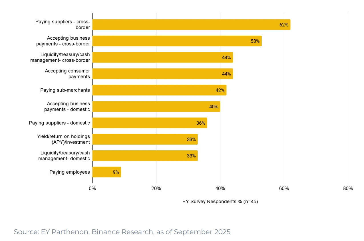 Интуитивно кажется, что основной спрос на стейблкоины исходит от розничных пользователей. Но данные говорят об обратном. По результатам опроса Ernst&Young, 62% компаний уже использовали стейблкоины для кроссбордер-платежей поставщикам, 53% — для приема международных платежей от клиентов. Для бизнеса это прежде всего инструмент операционных расчетов.