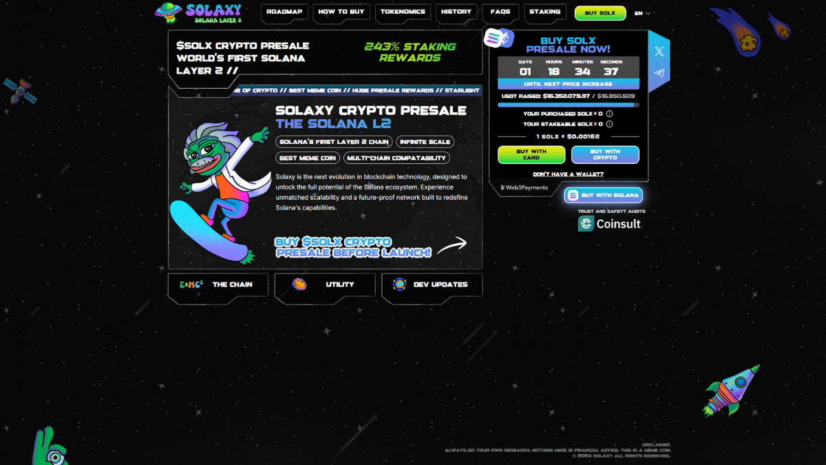 Инвесторы могут купить токен SOLX прямо на сайте предварительной продажи. На момент написания публикации стоимость SOLX составляет $0.00162. На следующем этапе пресейла мемкоин станет дороже. Проекту удалось привлечь почти $16 млн ранних инвестиций. APY при стейкинге нативного токена пока остается довольно высоким и составляет 244%.