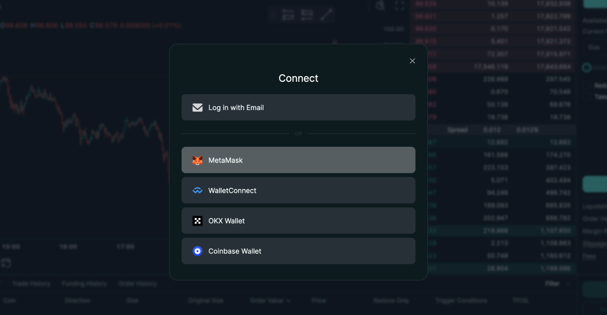 Чтобы начать торговлю на одном из доступных нефтяных бессрочных контрактов, вам нужно подключить к бирже ваш криптовалютный кошелек (MetaMask, Coinbase Wallet, OKX Wallet или другие через протокол WalletConnect — в частности, Trust Wallet, Rainbow Wallet