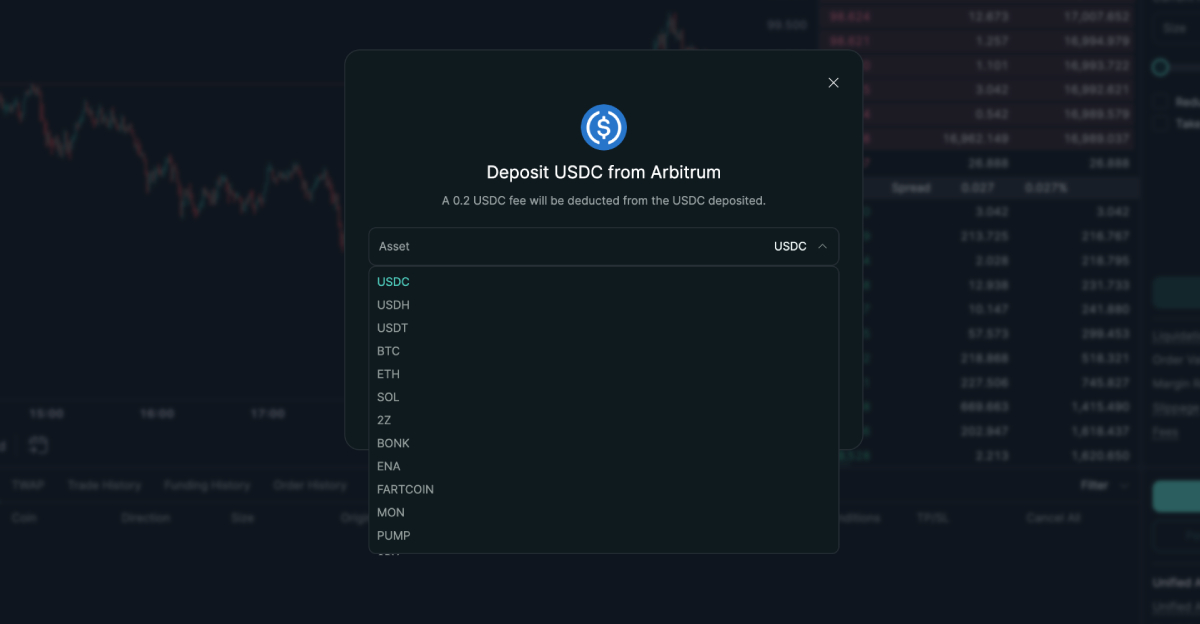 Далее нужно завести активы на биржу. Это могут быть стейблкоины, например USDC, USDH или USDT с автоматической конвертацией в USDC (только в блокчейнах Arbitrum), а также популярные криптовалюты на «родных» блокчейнах (ETH на Ethereum, SOL на Solana
