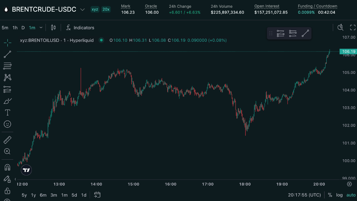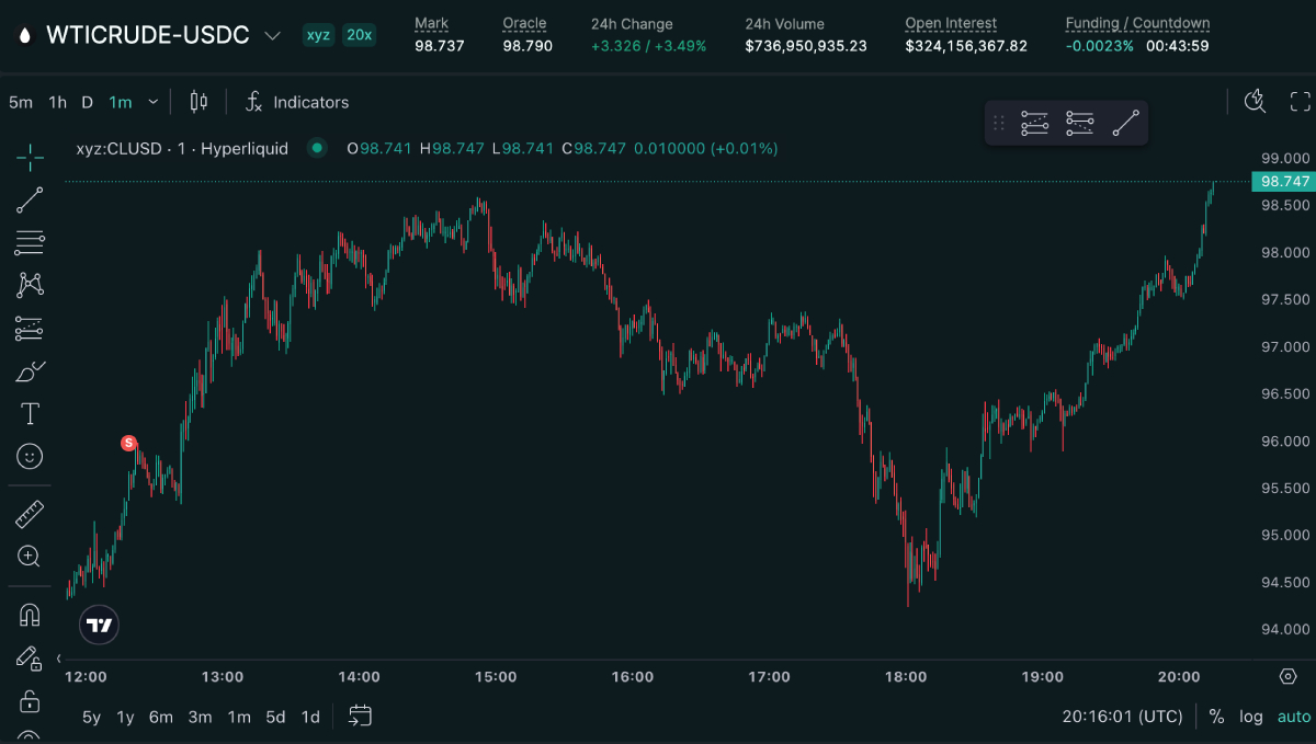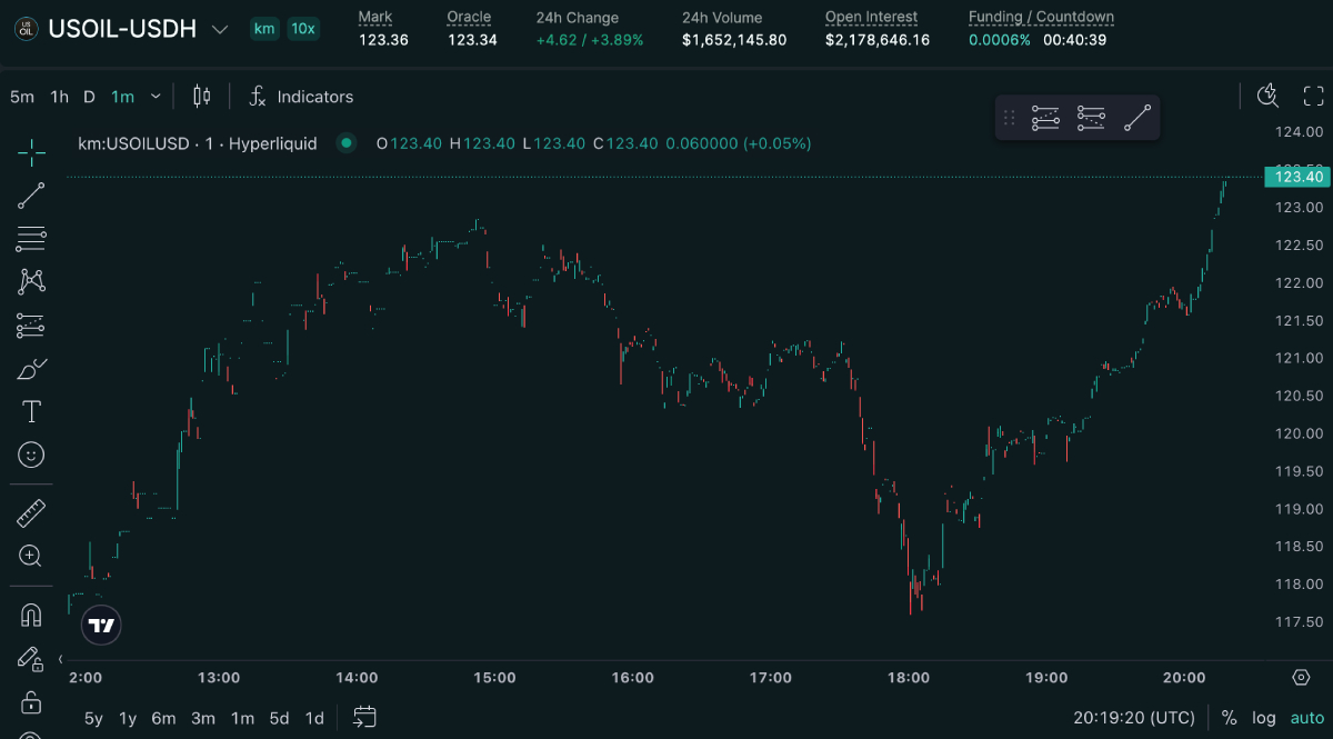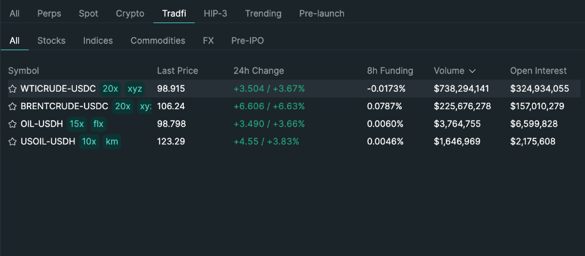 На сегодняшний день настоящим лидером в торговле нефтяными деривативами на базе блокчейн-технологий стал Hyperliquid. В начале марта объем торгов нефтяными бессрочными контрактами CL-USDC (с 18 марта — WTICRUDE-USDC) на платформе за сутки достиг $1,2 млрд, что сделало нефть вторым по популярности активом после биткоина. Это стало настоящим моментом истины для DeFi-систем, которые теперь позволяют трейдерам работать на нефтяных рынках в реальном времени и с любой суммой, когда традиционные биржи с их выходными и ограничениями не могут обеспечить доступ.