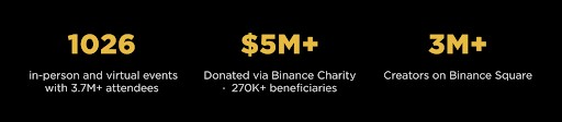 В 2025 году, согласно отчету, Binance провела 1 026 офлайн- и онлайн-мероприятий с 3,7 млн+ участников. Отдельно приведены детали: 553 офлайн-встречи и мероприятия собрали почти 520 000 участников, 473 виртуальных события — 3,2 млн участников; социальные аккаунты Binance достигли 25 млн подписчиков.