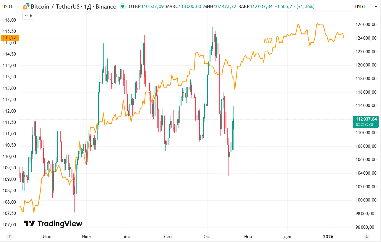 В последнее время стало модным увязывать ценовые колебания цифровых активов с глобальной денежной массой М2. В основном речь идет о том, что биткоин движется по глобальной денежной массе с отставанием в 3−6 месяцев. И действительно определенная связь прослеживается и логично предположение, что часть мировой ликвидности попадает в криптовалюты. Тогда нам следует посмотреть, что сейчас происходит с глобальной денежной массой?