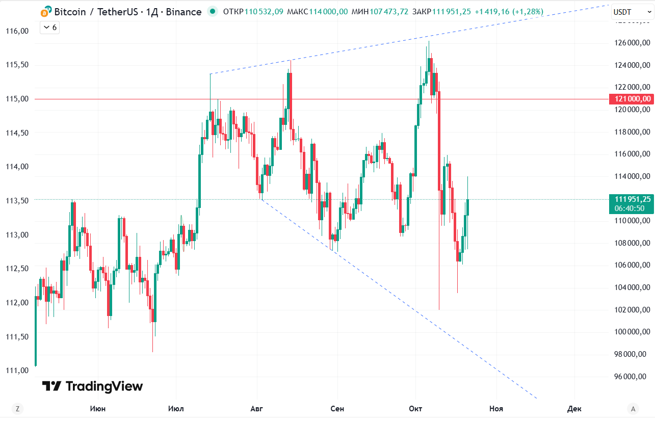 Обе формации имеют высокую вероятность реализации в том, что наиболее опасным является расширяющийся клин, который можно идентифицировать на дневном графике цифрового золота. При его формировании возрастает волатильность, сопровождающаяся кровопролитной борьбой за инициативу между быками и медведями. Ярким свидетельством этого являются ликвидации 10 октября, которые превысили $19 млрд. Для того, чтобы «взломать» этот паттерн быкам, необходимо поднять стоимость биткоин выше $121000, по Ethereum еще сложнее — нужен рост выше исторических максимумов.