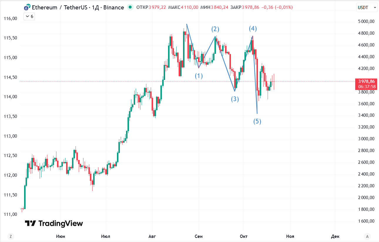 За период консолидации начиная с середины июля на графиках BTC и ETH сформировались медвежьи паттерны. По биткоину наблюдается расширяющийся клин (разработанная Томасом Булковским и впервые описанная в «Полной энциклопедии графических моделей), а по Ethereum первая волна в нисходящем направлении согласно волновой теории Эллиота.