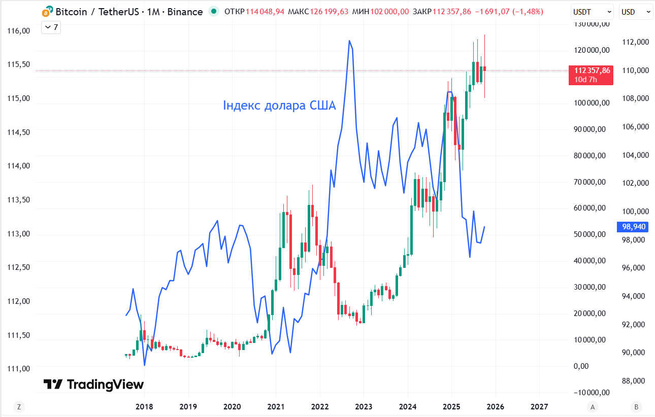 Биткоин — индекс доллара США (совмещенный график)