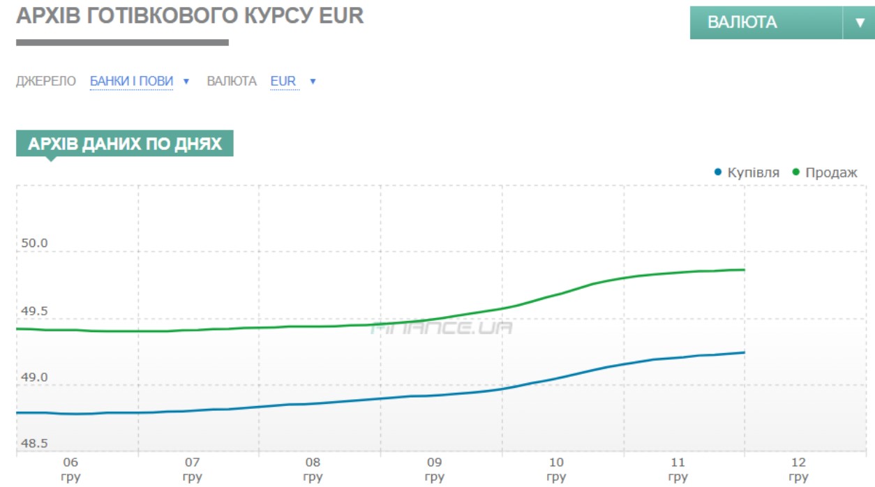 Курс евро на торгах взлетел сразу на 58 копеек — с начальных уровней понедельника 48,949/48,979 до 49,552/49,559 гривен к вечеру пятницы, а в обменниках к концу рабочего дня 12 декабря евровалюту продавали по 49,8 — 50 гривен.