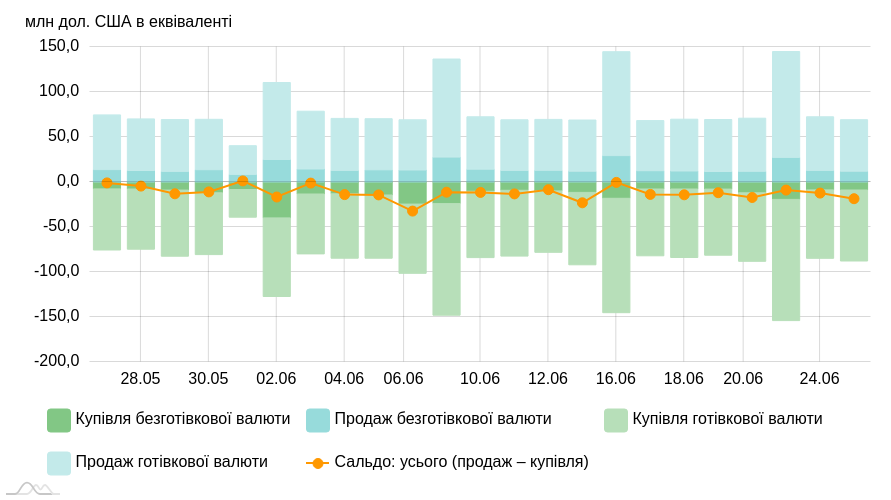 По моим прогнозам, в период с 30 июня по 4 июля объем операций на межбанке по системе Блумберг будет колебаться в пределах от $145 млн до $245 млн. Пик активности клиентов придется на 30 июня и 2−3 июля, а более спокойными будут 1 и 4 июля.