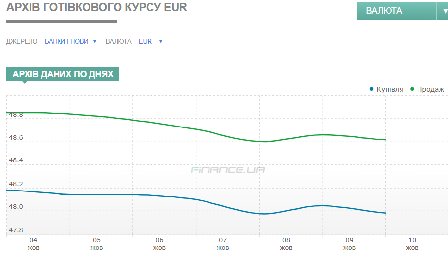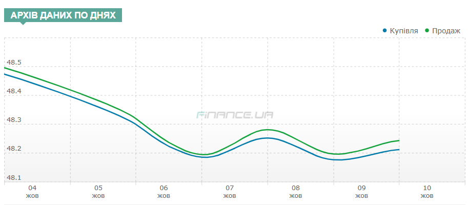 В итоге за период с 6 по 10 октября, если сравнивать только начальную и конечную даты периода, курс продажи доллара на украинском межбанке вырос на 35 копеек — с уровня 41,33/41,36 до 41,68/41,71 гривен, а курс продажи безналичного евро за этот же период просел на 10 копеек — с 48,3395 /48,3581 до 48,2320/48,2501 гривен.