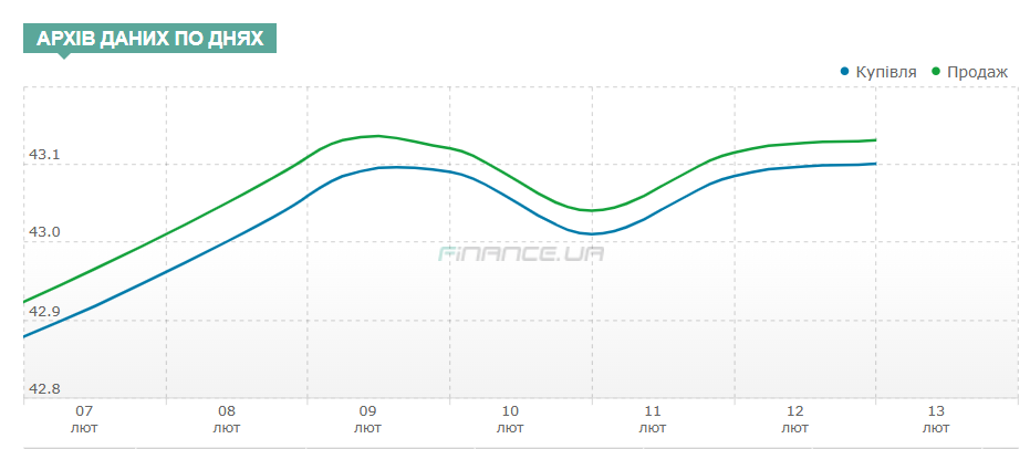 Эта неделя на валютном рынке Украины прошла с незначительными потерями для гривны. Со стартовых котировок понедельника, 9 февраля, 42,82/42,86 доллар к вечеру пятницы, 13 февраля, прибавил при продаже порядка 24 копеек и котировался в пределах уровня 43,07/43,10 гривен.