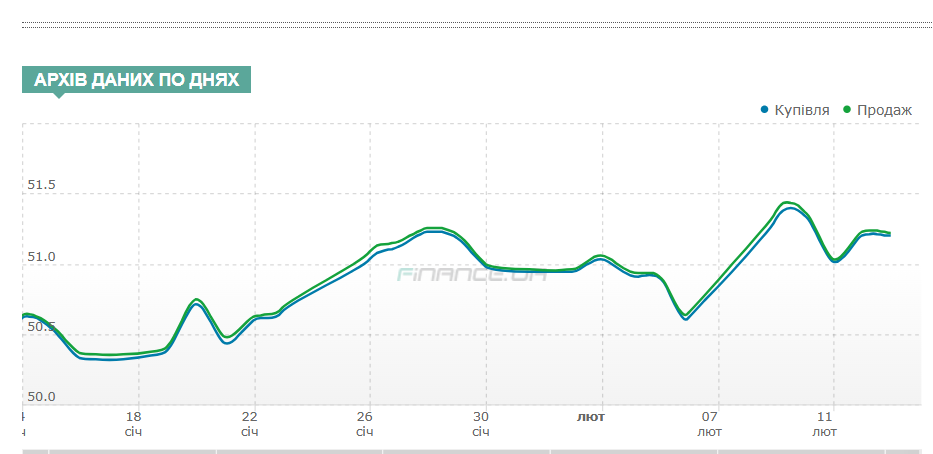 Сдала свои позиции гривна и к евро. Евровалюта при продаже с 9 по 13 февраля выросла на межбанке на 31 копейку — со стартовых уровней понедельника 50,7716/50,8019 до 51,0939 / 51,1122 гривен к концу пятничных торгов. На наличном рынке вечером 13 февраля евро продавался по 51,30 — 51,65 гривен.